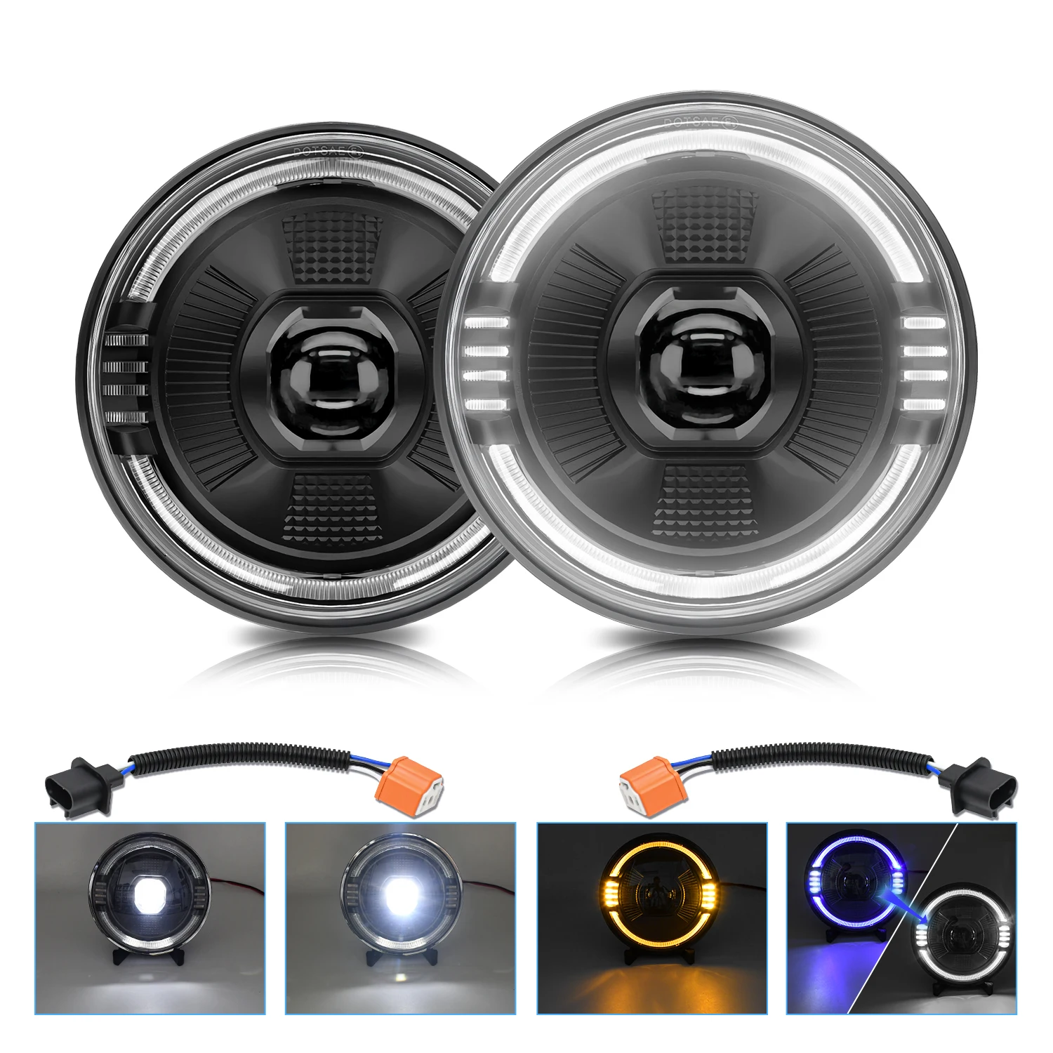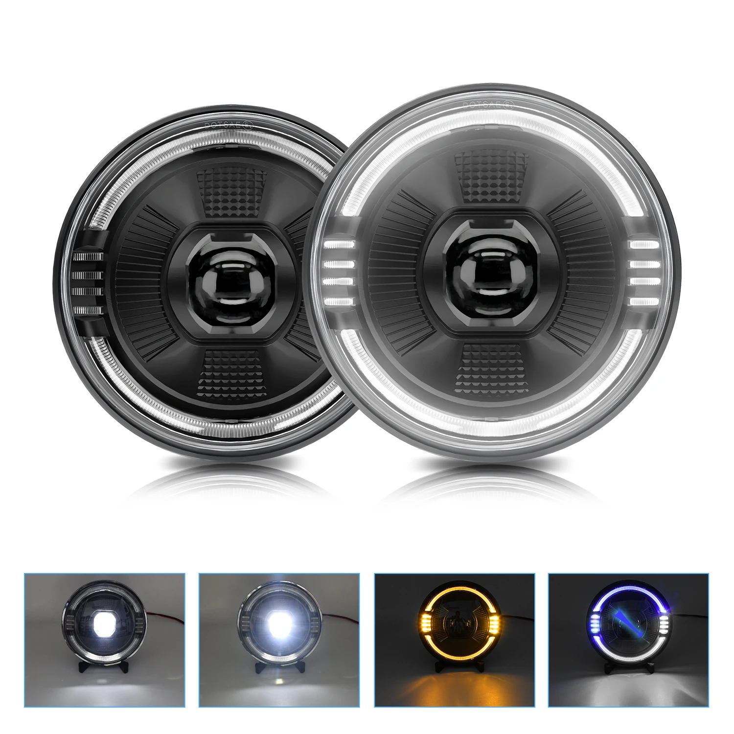 There are 4 lighting modes, high beam (white), low beam (white), daytime running lights (start blue light gradient white light - animation welcome halo DRL), and turn signal lights (yellow light), which perfectly replace the original halogen lights and meet various driving needs.