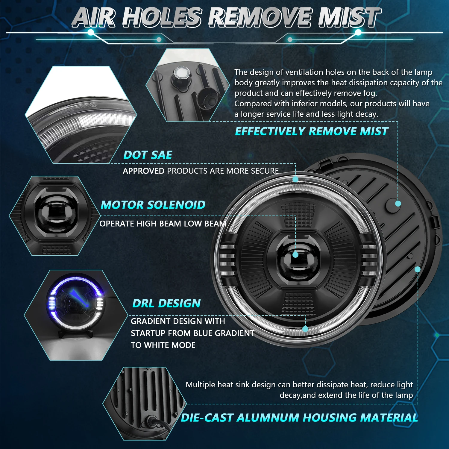 Adopting die cast aluminum shell and high-strength acrylic face mask, it is sturdy and durable. Fishfin shaped heat dissipation fins help with better heat dissipation/breathable holes, waterproof film ensures internal moisture and mist release/IP68 waterproof, dustproof and shockproof. It can adapt well to various harsh environments/strict standard design, ensuring driving safety.
